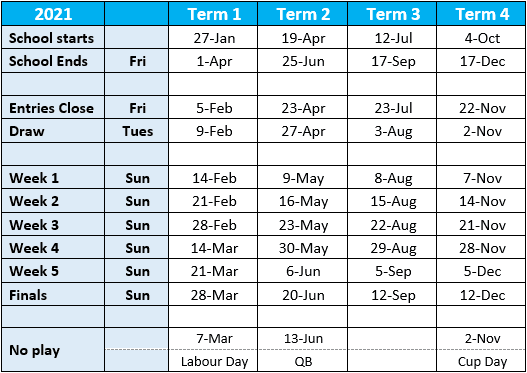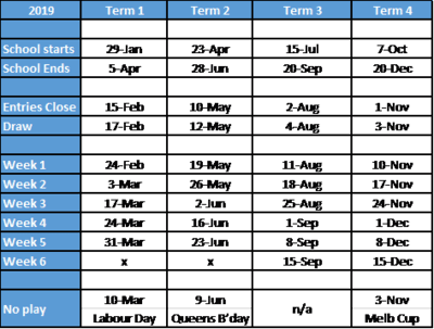 Competitions are held in each school term (1 to 4) and consist of 5 weeks of home & away matches followed by a finals day for BBQ and presentations.